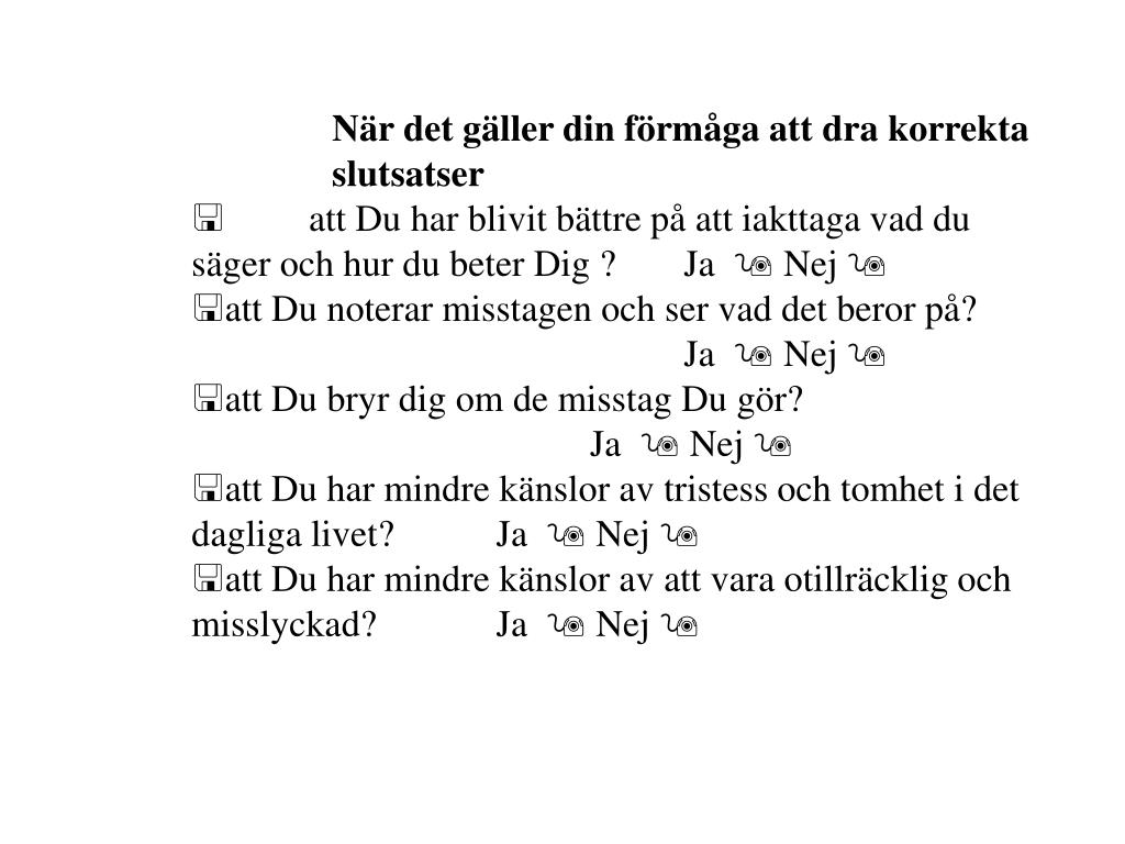När det gäller din förmåga att dra korrekta slutsatser • < att Du har blivit bättre på att iakttaga vad du säger och hur du beter Dig ? Ja 9 Nej 9 • att Du noterar misstagen och ser vad det beror på? Ja 9 Nej 9 • att Du bryr dig om de misstag Du gör? Ja 9 Nej 9 • att Du har mindre känslor av tristess och tomhet i det dagliga livet? Ja 9 Nej 9 • att Du har mindre känslor av att vara otillräcklig och misslyckad? Ja 9 Nej 9