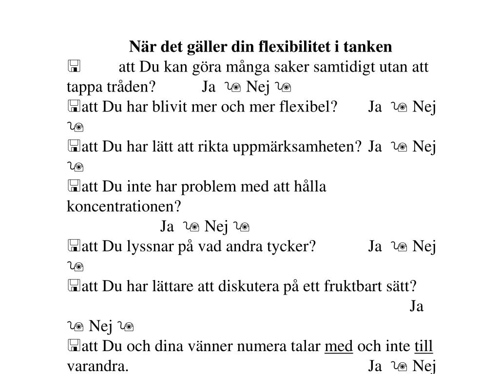 När det gäller din flexibilitet i tanken • < att Du kan göra många saker samtidigt utan att tappa tråden? Ja 9 Nej 9 • att Du har blivit mer och mer flexibel? Ja 9 Nej 9 • att Du har lätt att rikta uppmärksamheten? Ja 9 Nej 9 • att Du inte har problem med att hålla koncentrationen? Ja 9 Nej 9 • att Du lyssnar på vad andra tycker? Ja 9 Nej 9 • att Du har lättare att diskutera på ett fruktbart sätt? Ja 9 Nej 9 • att Du och dina vänner numera talar med och inte till varandra. Ja 9 Nej 9