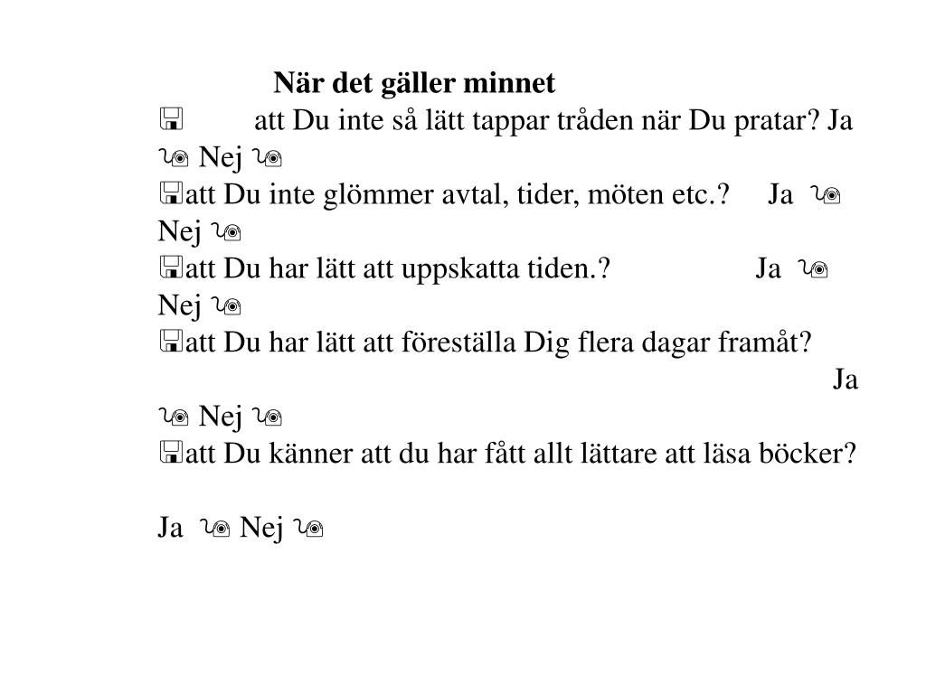 När det gäller minnet • < att Du inte så lätt tappar tråden när Du pratar? Ja 9 Nej 9 • att Du inte glömmer avtal, tider, möten etc.? Ja 9 Nej 9 • att Du har lätt att uppskatta tiden.? Ja 9 Nej 9 • att Du har lätt att föreställa Dig flera dagar framåt? Ja 9 Nej 9 • att Du känner att du har fått allt lättare att läsa böcker? Ja 9 Nej 9