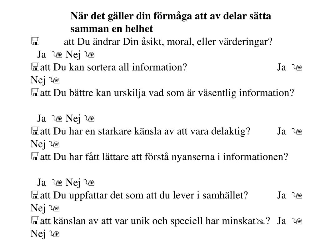 När det gäller din förmåga att av delar sätta samman en helhet • < att Du ändrar Din åsikt, moral, eller värderingar? Ja 9 Nej 9 • att Du kan sortera all information? Ja 9 Nej 9 • att Du bättre kan urskilja vad som är väsentlig information? Ja 9 Nej 9 • att Du har en starkare känsla av att vara delaktig? Ja 9 Nej 9 • att Du har fått lättare att förstå nyanserna i informationen? Ja 9 Nej 9 • att Du uppfattar det som att du lever i samhället? Ja 9 Nej 9 • att känslan av att var unik och speciell har minskat@? Ja 9 Nej 9 • att Du har en växande känsla av att Du känner dig själv? Ja 9 Nej 9