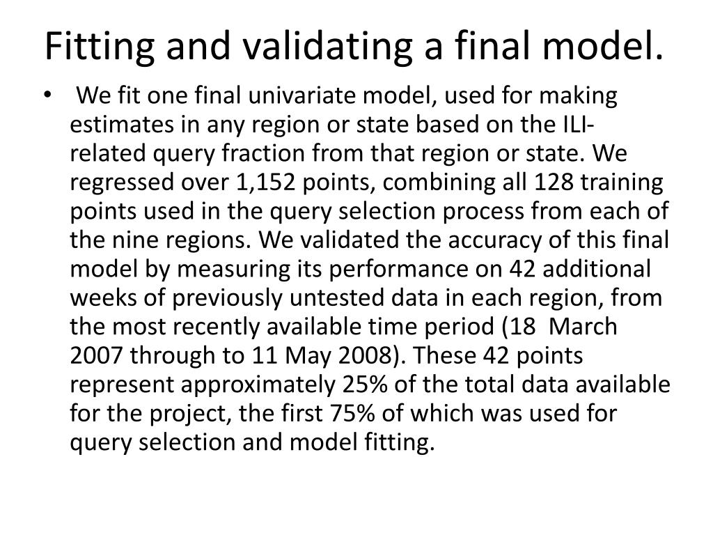 Fitting and validating a final model. • We fit one final univariate model, used for making estimates in any region or state based on the ILI-related query fraction from that region or state. We regressed over 1,152 points, combining all 128 training points used in the query selection process from each of the nine regions. We validated the accuracy of this final model by measuring its performance on 42 additional weeks of previously untested data in each region, from the most recently available time period (18 March 2007 through to 11 May 2008). These 42 points represent approximately 25% of the total data available for the project, the first 75% of which was used for query selection and model fitting.