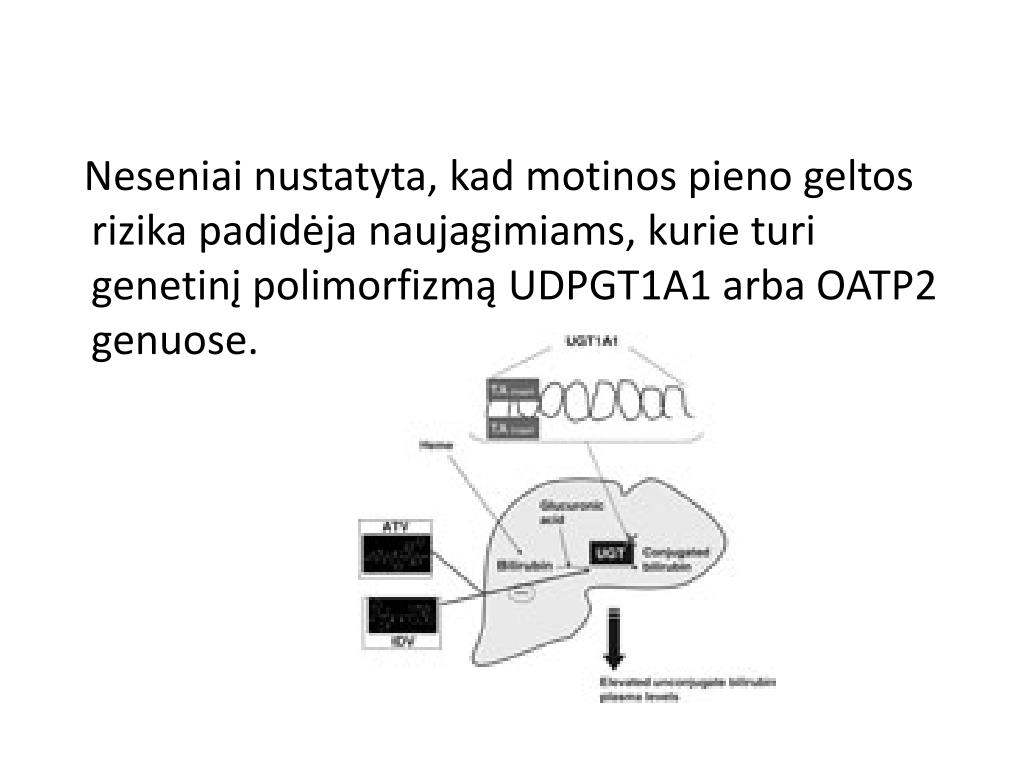 Neseniai nustatyta, kad motinos pieno geltos rizika padidėja naujagimiams, kurie turi genetinį polimorfizmą UDPGT1A1 arba OATP2 genuose.