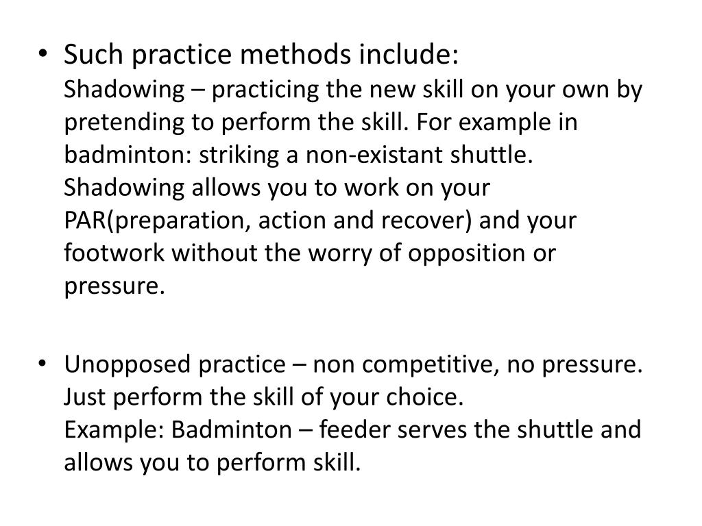 Such practice methods include:Shadowing – practicing the new skill on your own by pretending to perform the skill. For example in badminton: striking a non-existant shuttle.Shadowing allows you to work on your PAR(preparation, action and recover) and your footwork without the worry of opposition or pressure. • Unopposed practice – non competitive, no pressure. Just perform the skill of your choice.Example: Badminton – feeder serves the shuttle and allows you to perform skill.