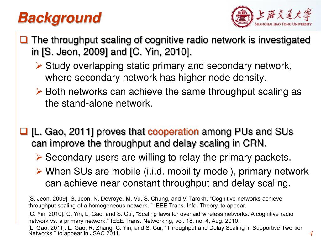 Background • The throughput scaling of cognitive radio network is investigated in [S. Jeon, 2009] and [C. Yin, 2010]. • Study overlapping static primary and secondary network, where secondary network has higher node density. • Both networks can achieve the same throughput scaling as the stand-alone network. • [L. Gao, 2011] proves that cooperation among PUs and SUs can improve the throughput and delay scaling in CRN. • Secondary users are willing to relay the primary packets. • When SUs are mobile (i.i.d. mobility model), primary network can achieve near constant throughput and delay scaling. [S. Jeon, 2009]: S. Jeon, N. Devroye, M. Vu, S. Chung, and V. Tarokh, “Cognitive networks achieve throughput scaling of a homogeneous network, ” IEEE Trans. Info. Theory, to appear. [C. Yin, 2010]: C. Yin, L. Gao, and S. Cui, “Scaling laws for overlaid wireless networks: A cognitive radio network vs. a primary network,” IEEE Trans. Networking, vol. 18, no. 4, Aug. 2010. [L. Gao, 2011]: L. Gao, R. Zhang, C. Yin, and S. Cui, “Throughput and Delay Scaling in Supportive Two-tier Networks ” to appear in JSAC 2011.