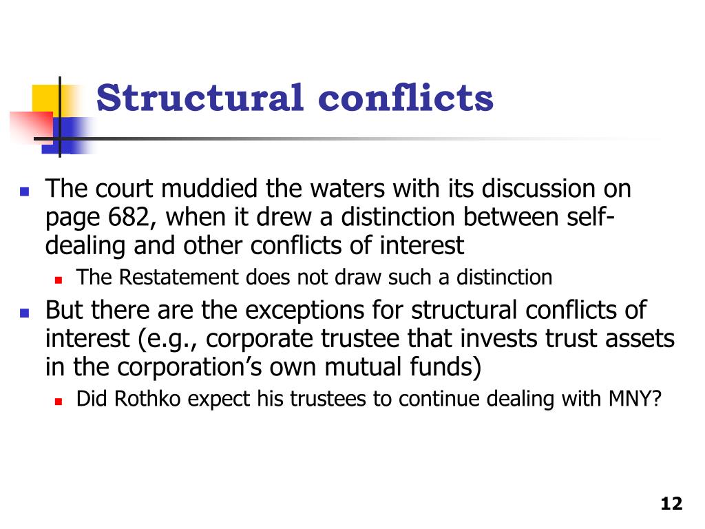 Structural conflicts • The court muddied the waters with its discussion on page 682, when it drew a distinction between self-dealing and other conflicts of interest • The Restatement does not draw such a distinction • But there are the exceptions for structural conflicts of interest (e.g., corporate trustee that invests trust assets in the corporation’s own mutual funds) • Did Rothko expect his trustees to continue dealing with MNY?