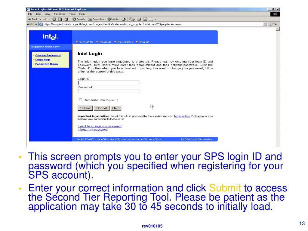 Preparing to use Intel’s online reporting tool • Prior to logging into the reporting tool, you must have an ID and password to access Intel’s Supplier Presence Site (SPS). • You only need to register for an SPS account once. • If you have a current SPS account, you will only need to request access to the Second Tier tool. • If you do not have a SPS account, go to http://supplier2.intel.com and select the Registration link in the left navigation menu. While you are registering for an SPS account, you can also request access to the Second Tier tool. • It is important to remember your SPS login ID and password. This is the same login you will use to semi-annually access Intel’s Second Tier Reporting Tool. • Since SPS accounts issued and tracked by individual user there may be several accounts for one supplier. For these reporting purposes, the person requesting the account should be the primary individual responsible for providing diversity spends data.