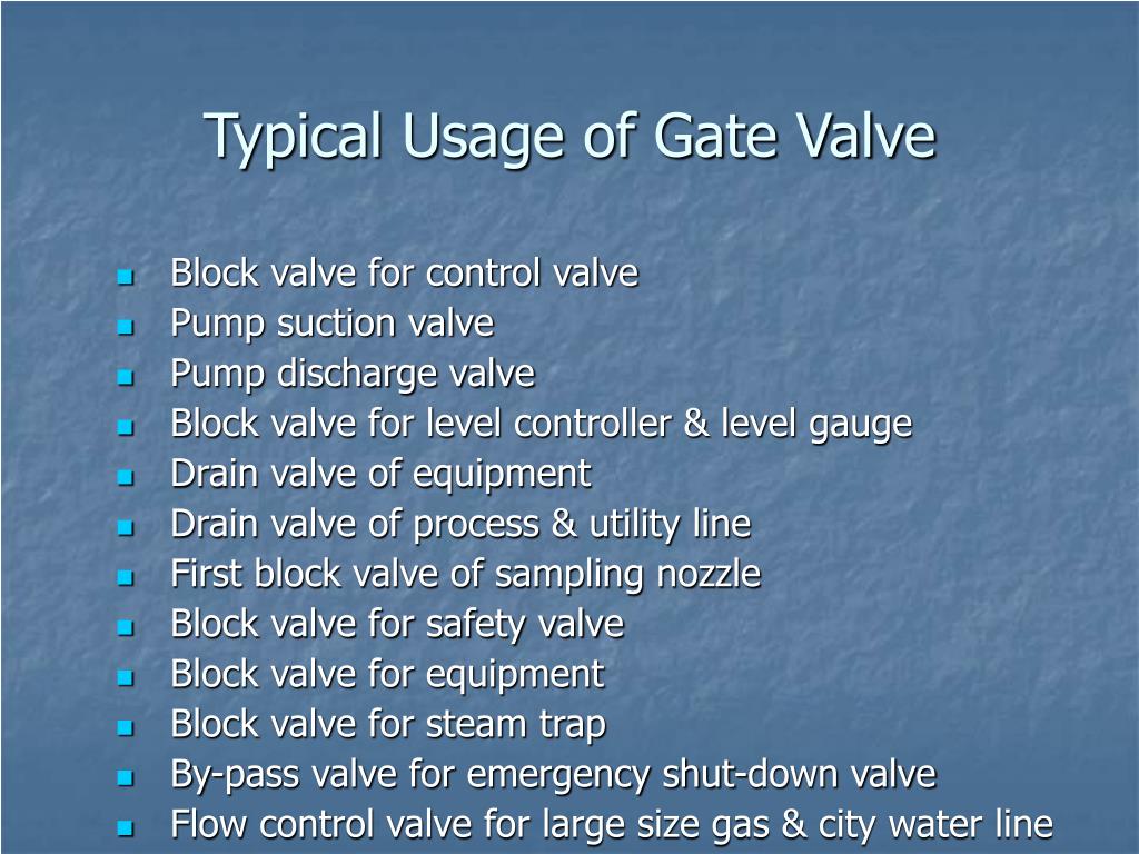 Typical Usage of Gate Valve • Block valve for control valve • Pump suction valve • Pump discharge valve • Block valve for level controller & level gauge • Drain valve of equipment • Drain valve of process & utility line • First block valve of sampling nozzle • Block valve for safety valve • Block valve for equipment • Block valve for steam trap • By-pass valve for emergency shut-down valve • Flow control valve for large size gas & city water line