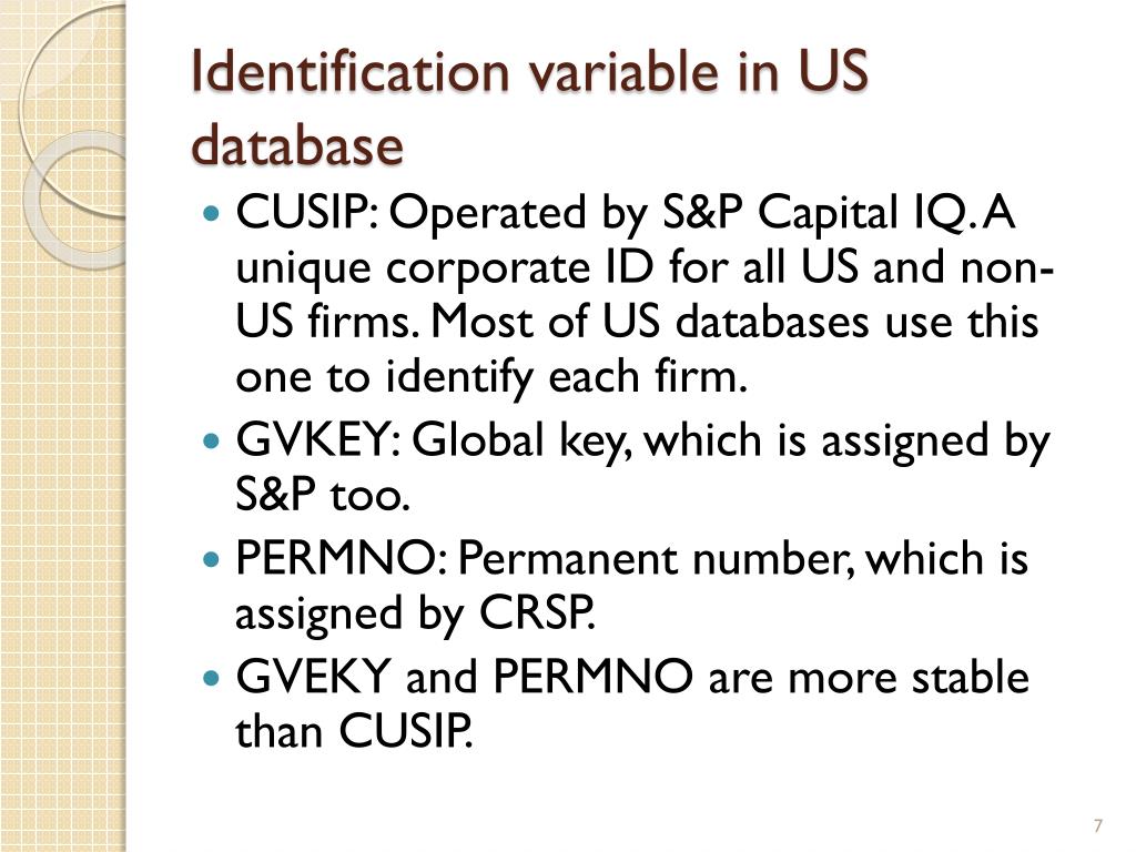 Identification variable in US database • CUSIP: Operated by S&P Capital IQ. A unique corporate ID for all US and non-US firms. Most of US databases use this one to identify each firm. • GVKEY: Global key, which is assigned by S&P too. • PERMNO: Permanent number, which is assigned by CRSP. • GVEKY and PERMNO are more stable than CUSIP.
