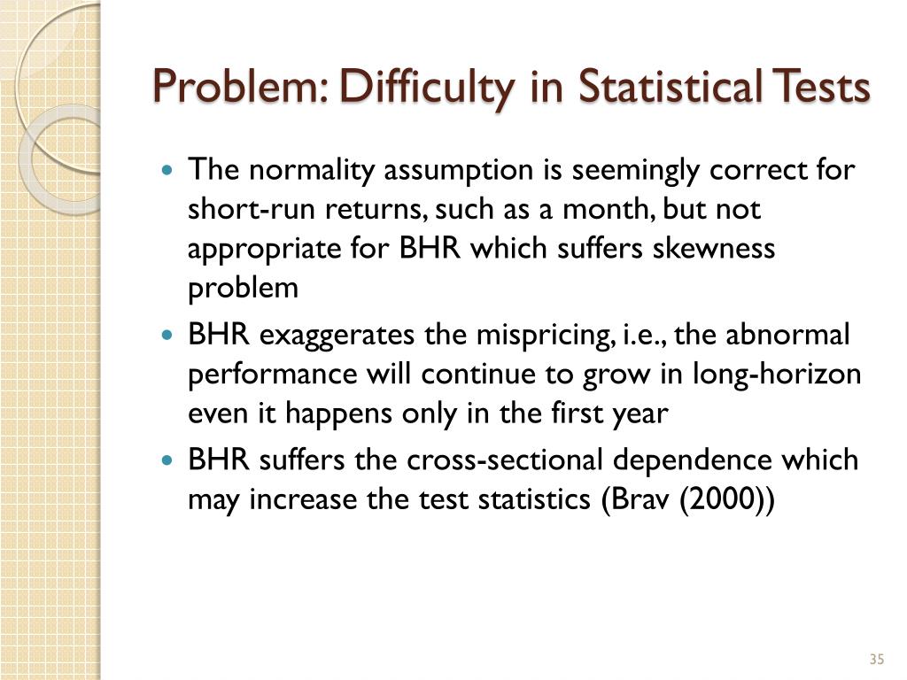 Problem: Difficulty in Statistical Tests • The normality assumption is seemingly correct for short-run returns, such as a month, but not appropriate for BHR which suffers skewness problem • BHR exaggerates the mispricing, i.e., the abnormal performance will continue to grow in long-horizon even it happens only in the first year • BHR suffers the cross-sectional dependence which may increase the test statistics (Brav (2000))