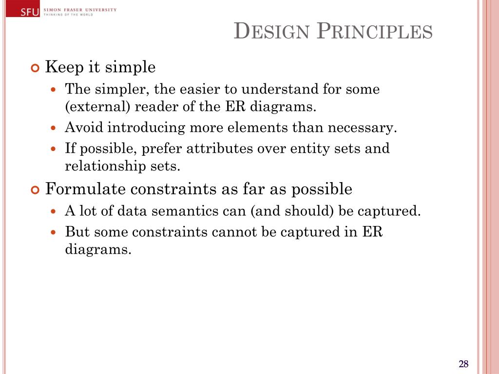 Design Principles • Keep it simple • The simpler, the easier to understand for some (external) reader of the ER diagrams. • Avoid introducing more elements than necessary. • If possible, prefer attributes over entity sets and relationship sets. • Formulate constraints as far as possible • A lot of data semantics can (and should) be captured. • But some constraints cannot be captured in ER diagrams.