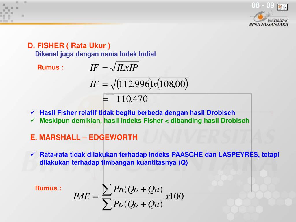 08 - 09 D. FISHER ( Rata Ukur ) Dikenal juga dengan nama Indek Indial Rumus : • Hasil Fisher relatif tidak begitu berbeda dengan hasil Drobisch • Meskipun demikian, hasil indeks Fisher < dibanding hasil Drobisch • E. MARSHALL – EDGEWORTH • Rata-rata tidak dilakukan terhadap indeks PAASCHE dan LASPEYRES, tetapi dilakukan terhadap timbangan kuantitasnya (Q) Rumus :
