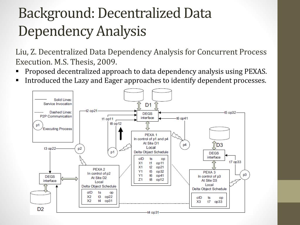 Background: Decentralized Data Dependency Analysis • Liu, Z. Decentralized Data Dependency Analysis for Concurrent Process Execution. M.S. Thesis, 2009. • Proposed decentralized approach to data dependency analysis using PEXAS. • Introduced the Lazy and Eager approaches to identify dependent processes.