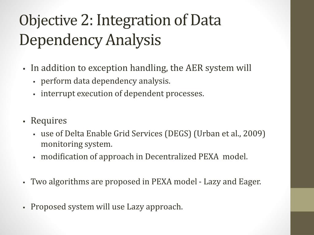 Objective 2: Integration of Data Dependency Analysis • In addition to exception handling, the AER system will • perform data dependency analysis. • interrupt execution of dependent processes. • Requires • use of Delta Enable Grid Services (DEGS) (Urban et al., 2009) monitoring system. • modification of approach in Decentralized PEXA model. • Two algorithms are proposed in PEXA model - Lazy and Eager. • Proposed system will use Lazy approach.