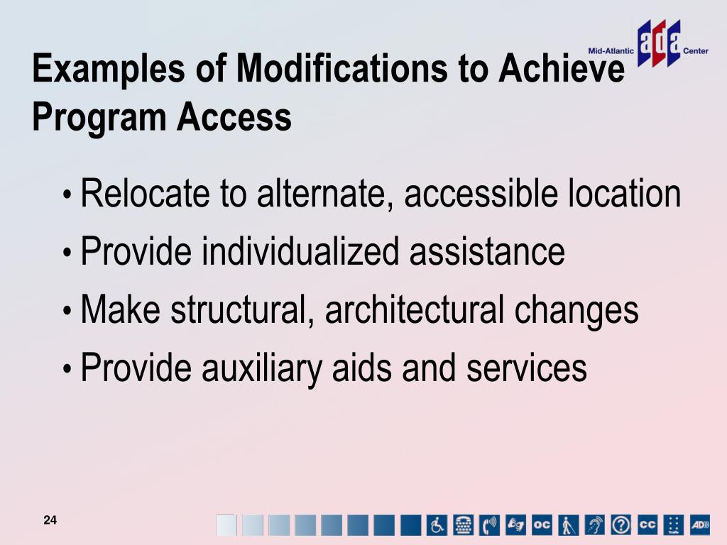 Examples of Modifications to Achieve Program Access • Relocate to alternate, accessible location • Provide individualized assistance • Make structural, architectural changes • Provide auxiliary aids and services