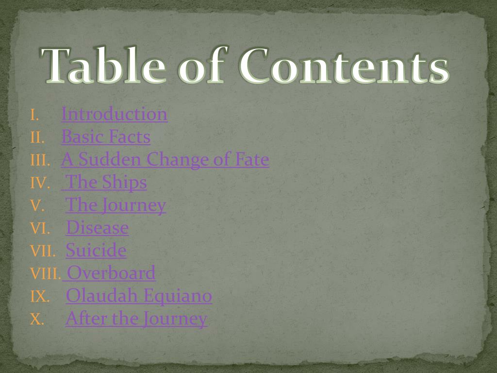 Table of Contents • Introduction • Basic Facts • A Sudden Change of Fate • The Ships • The Journey • Disease • Suicide • Overboard • OlaudahEquiano • After the Journey