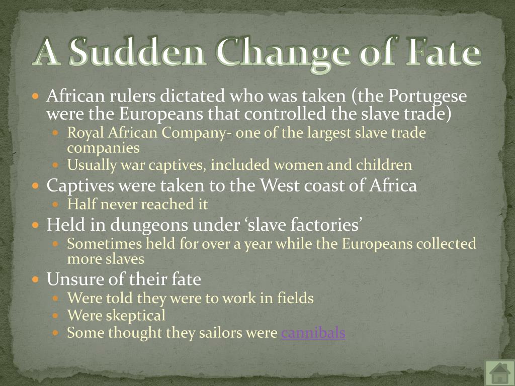 A Sudden Change of Fate • African rulers dictated who was taken (the Portugese were the Europeans that controlled the slave trade) • Royal African Company- one of the largest slave trade companies • Usually war captives, included women and children • Captives were taken to the West coast of Africa • Half never reached it • Held in dungeons under ‘slave factories’ • Sometimes held for over a year while the Europeans collected more slaves • Unsure of their fate • Were told they were to work in fields • Were skeptical • Some thought they sailors were cannibals