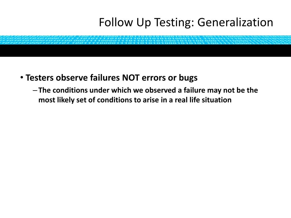 Follow Up Testing: Generalization • Testers observe failures NOT errors or bugs • The conditions under which we observed a failure may not be the most likely set of conditions to arise in a real life situation
