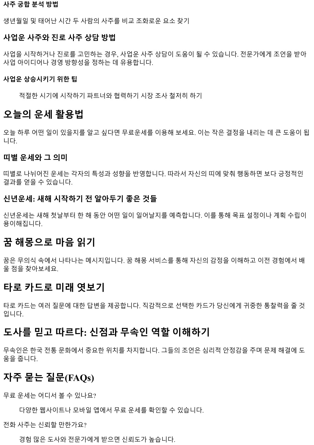 2. 사주궁합분석방법 생년월일및태어난시간두사람의사주를비교조화로운요소찾기 사업운사주와진로사주상담방법 사업을시작하거나진로를고민하는경우, 사업운사주상담이도움이될수있습니다. 전문가에게조언을받아 사업아이디어나경영방향성을정하는데유용합니다. 사업운상승시키기위한팁 적절한시기에시작하기파트너와협력하기시장조사철저히하기 오늘의운세활용법 오늘하루어떤일이있을지를알고싶다면무료운세를이용해보세요. 이는작은결정을내리는데큰도움이됩 니다. 띠별운세와그의미 띠별로나뉘어진운세는각자의특성과성향을반영합니다. 따라서자신의띠에맞춰행동하면보다긍정적인 결과를얻을수있습니다. 신년운세: 새해시작하기전알아두기좋은것들 신년운세는새해첫날부터한해동안어떤일이일어날지를예측합니다. 이를통해목표설정이나계획수립이 용이해집니다. 꿈해몽으로마음읽기 꿈은무의식속에서나타나는메시지입니다. 꿈해몽서비스를통해자신의감정을이해하고이전경험에서배 울점을찾아보세요. 타로카드로미래엿보기 타로카드는여러질문에대한답변을제공합니다. 직감적으로선택한카드가당신에게귀중한통찰력을줄것 입니다. 도사를믿고따르다: 신점과무속인역할이해하기 무속인은한국전통문화에서중요한위치를차지합니다. 그들의조언은심리적안정감을주며문제해결에도 움을줍니다. 자주묻는질문(FAQs) 무료운세는어디서볼수있나요? 다양한웹사이트나모바일앱에서무료운세를확인할수있습니다. 전화사주는신뢰할만한가요? 경험많은도사와전문가에게받으면신뢰도가높습니다.