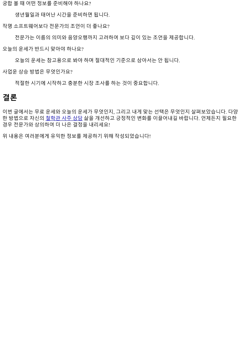 3. 궁합볼때어떤정보를준비해야하나요? 생년월일과태어난시간을준비하면됩니다. 작명소프트웨어보다전문가의조언이더좋나요? 전문가는이름의의미와음양오행까지고려하여보다깊이있는조언을제공합니다. 오늘의운세가반드시맞아야하나요? 오늘의운세는참고용으로봐야하며절대적인기준으로삼아서는안됩니다. 사업운상승방법은무엇인가요? 적절한시기에시작하고충분한시장조사를하는것이중요합니다. 결론 이번글에서는무료운세와오늘의운세가무엇인지, 그리고내게맞는선택은무엇인지살펴보았습니다. 다양 한방법으로자신의철학관사주상담삶을개선하고긍정적인변화를이끌어내길바랍니다. 언제든지필요한 경우전문가와상의하여더나은결정을내리세요! 위내용은여러분에게유익한정보를제공하기위해작성되었습니다!