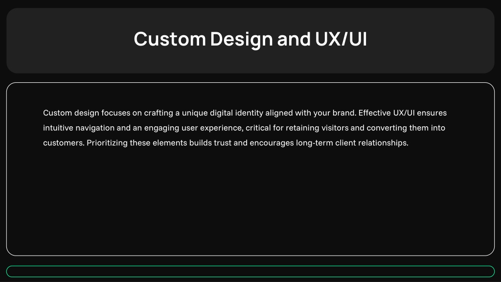 4. Custom design focuses on crafting a unique digital identity aligned with your brand. Effective UX/UI ensures intuitive navigation and an engaging user experience, critical for retaining visitors and converting them into customers. Prioritizing these elements builds trust and encourages long-term client relationships. Custom Design and UX/UI