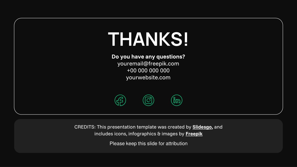 12. Do you have any questions? youremail@freepik.com +00 000 000 000 yourwebsite.com THANKS! Please keep this slide for attribution