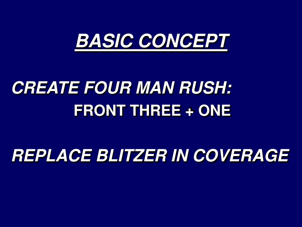 BASIC CONCEPT CREATE FOUR MAN RUSH: FRONT THREE + ONE REPLACE BLITZER IN COVERAGE