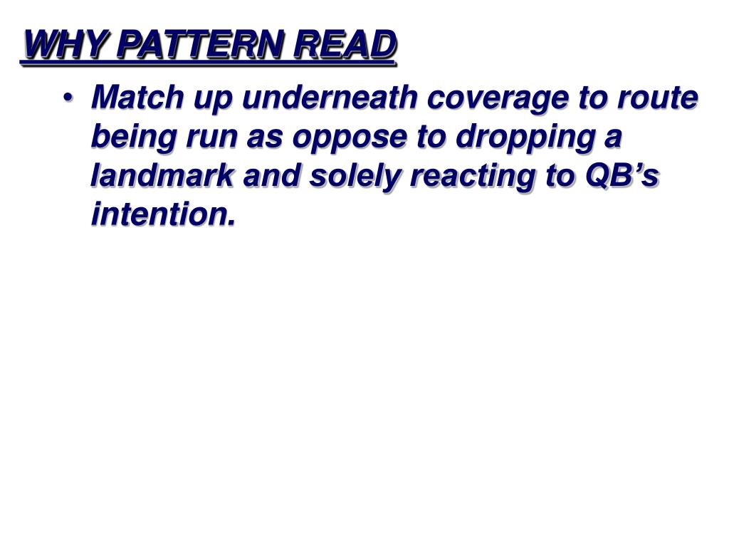 WHY PATTERN READ • Match up underneath coverage to route being run as oppose to dropping a landmark and solely reacting to QB’s intention.