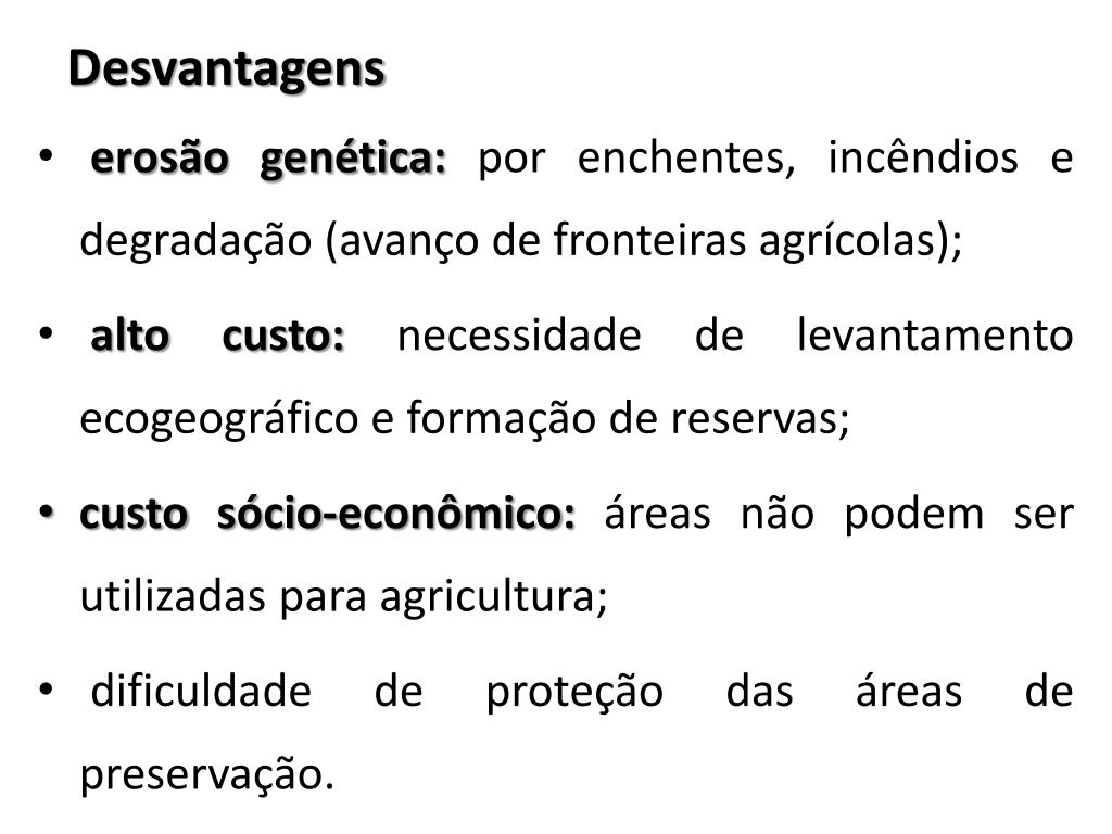 Desvantagens • erosão genética: por enchentes, incêndios e degradação (avanço de fronteiras agrícolas); • alto custo: necessidade de levantamento ecogeográfico e formação de reservas; • custo sócio-econômico: áreas não podem ser utilizadas para agricultura; • dificuldade de proteção das áreas de preservação.