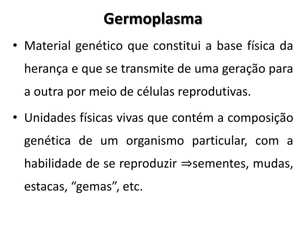 Germoplasma • Material genético que constitui a base física da herança e que se transmite de uma geração para a outra por meio de células reprodutivas. • Unidades físicas vivas que contém a composição genética de um organismo particular, com a habilidade de se reproduzir ⇒sementes, mudas, estacas, “gemas”, etc.