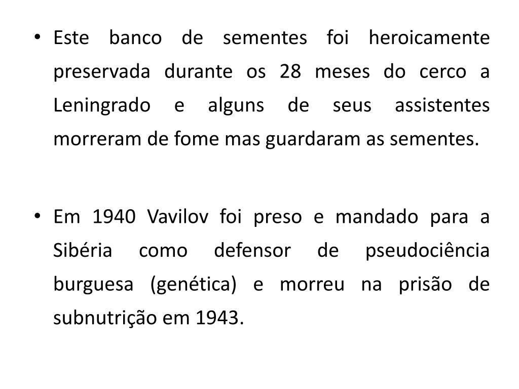 Este banco de sementes foi heroicamente preservada durante os 28 meses do cerco a Leningrado e alguns de seus assistentes morreram de fome mas guardaram as sementes. • Em 1940 Vavilov foi preso e mandado para a Sibéria como defensor de pseudociência burguesa (genética) e morreu na prisão de subnutrição em 1943.