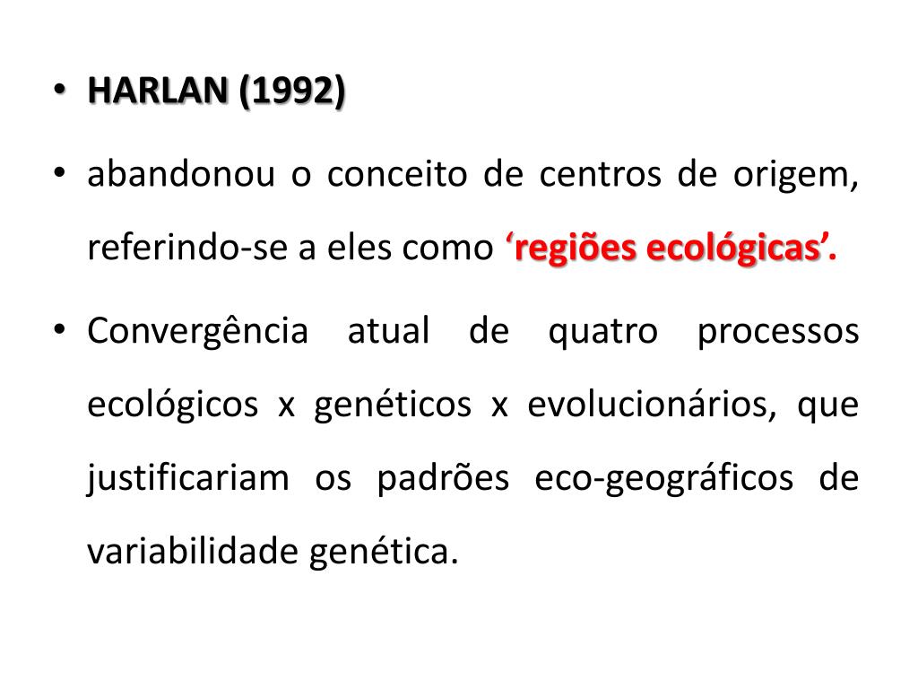 HARLAN (1992) • abandonou o conceito de centros de origem, referindo-se a eles como ‘regiões ecológicas’. • Convergência atual de quatro processos ecológicos x genéticos x evolucionários, que justificariam os padrões eco-geográficos de variabilidade genética.