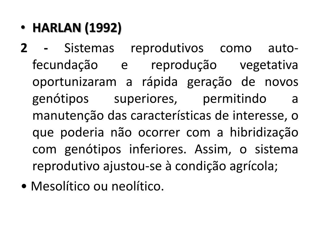 HARLAN (1992) 2 - Sistemas reprodutivos como auto-fecundação e reprodução vegetativa oportunizaram a rápida geração de novos genótipos superiores, permitindo a manutenção das características de interesse, o que poderia não ocorrer com a hibridização com genótipos inferiores. Assim, o sistema reprodutivo ajustou-se à condição agrícola; • Mesolítico ou neolítico.