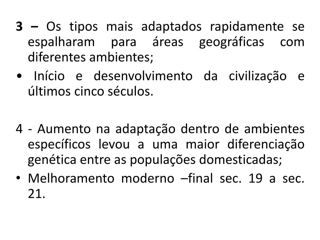 3 – Os tipos mais adaptados rapidamente se espalharam para áreas geográficas com diferentes ambientes; • Início e desenvolvimento da civilização e últimos cinco séculos. 4 - Aumento na adaptação dentro de ambientes específicos levou a uma maior diferenciação genética entre as populações domesticadas; • Melhoramento moderno –final sec. 19 a sec. 21.
