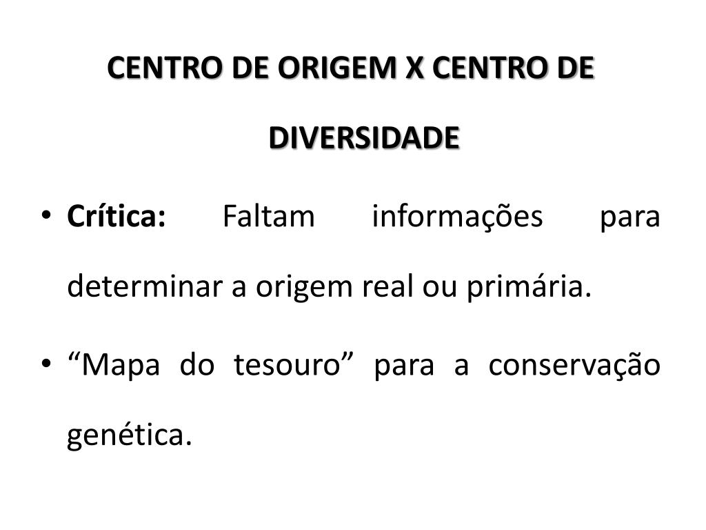 CENTRO DE ORIGEM X CENTRO DE DIVERSIDADE • Crítica: Faltam informações para determinar a origem real ou primária. • “Mapa do tesouro” para a conservação genética.