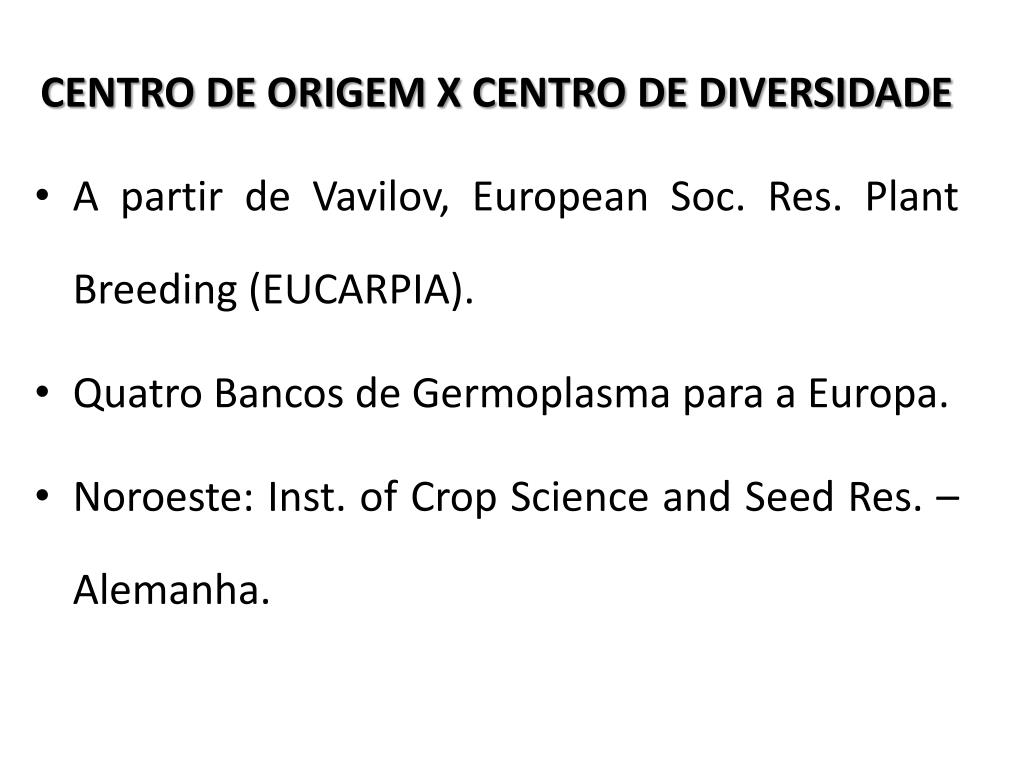 CENTRO DE ORIGEM X CENTRO DE DIVERSIDADE • A partir de Vavilov, European Soc. Res. PlantBreeding (EUCARPIA). • Quatro Bancos de Germoplasma para a Europa. • Noroeste: Inst. of Crop Science and Seed Res. – Alemanha.