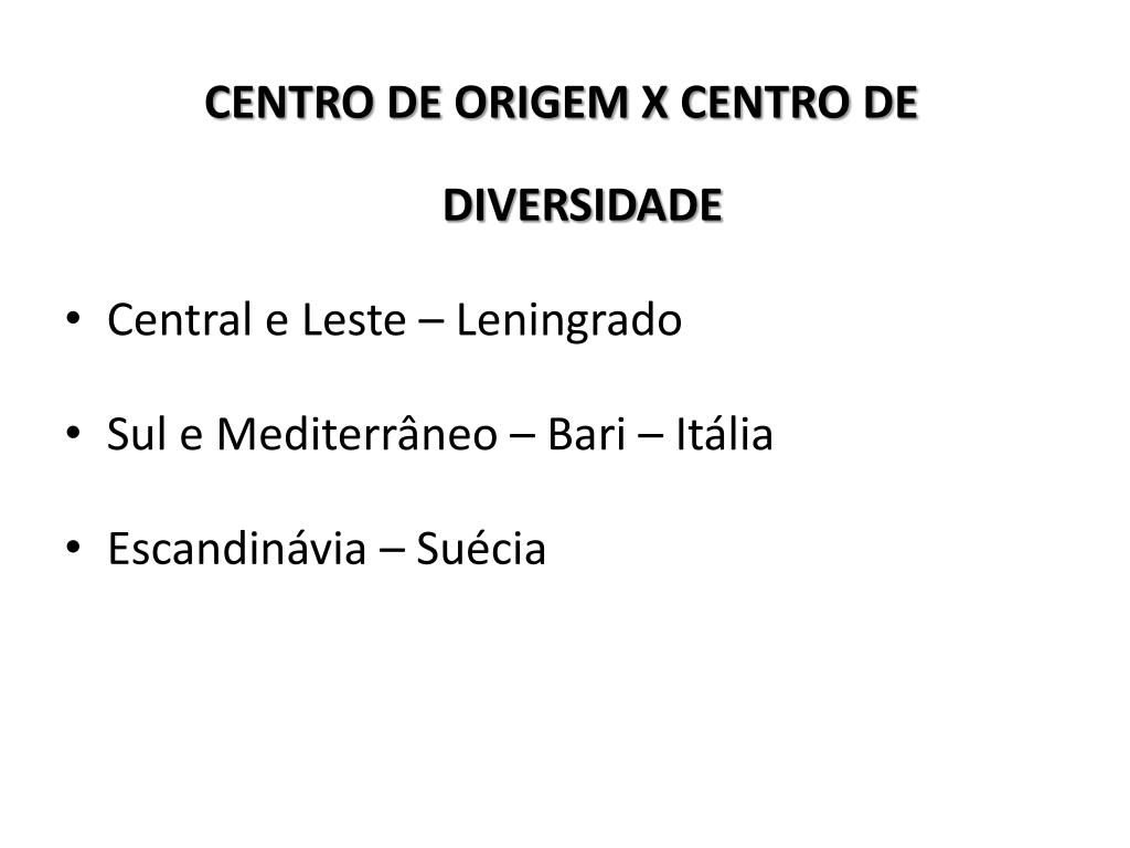 CENTRO DE ORIGEM X CENTRO DE DIVERSIDADE • Central e Leste – Leningrado • Sul e Mediterrâneo – Bari – Itália • Escandinávia – Suécia