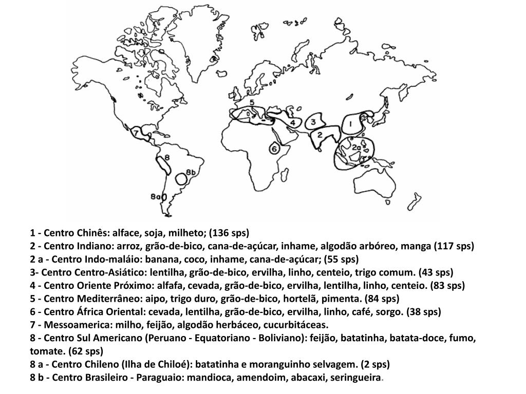 1 - Centro Chinês: alface, soja, milheto; (136 sps) 2 - Centro Indiano: arroz, grão-de-bico, cana-de-açúcar, inhame, algodão arbóreo, manga (117 sps) 2 a - Centro Indo-maláio: banana, coco, inhame, cana-de-açúcar; (55 sps) 3- Centro Centro-Asiático: lentilha, grão-de-bico, ervilha, linho, centeio, trigo comum. (43 sps) 4 - Centro Oriente Próximo: alfafa, cevada, grão-de-bico, ervilha, lentilha, linho, centeio. (83 sps) 5 - Centro Mediterrâneo: aipo, trigo duro, grão-de-bico, hortelã, pimenta. (84 sps) 6 - Centro África Oriental: cevada, lentilha, grão-de-bico, ervilha, linho, café, sorgo. (38 sps) 7 - Messoamerica: milho, feijão, algodão herbáceo, cucurbitáceas. 8 - Centro Sul Americano (Peruano - Equatoriano - Boliviano): feijão, batatinha, batata-doce, fumo, tomate. (62 sps) 8 a - Centro Chileno (Ilha de Chiloé): batatinha e moranguinho selvagem. (2 sps) 8 b - Centro Brasileiro - Paraguaio: mandioca, amendoim, abacaxi, seringueira.