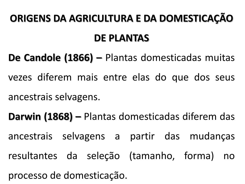 ORIGENS DA AGRICULTURA E DA DOMESTICAÇÃO DE PLANTAS De Candole (1866) – Plantas domesticadas muitas vezes diferem mais entre elas do que dos seus ancestrais selvagens. Darwin (1868) – Plantas domesticadas diferem das ancestrais selvagens a partir das mudanças resultantes da seleção (tamanho, forma) no processo de domesticação.