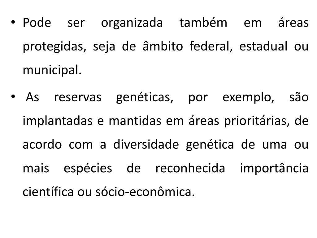 Pode ser organizada também em áreas protegidas, seja de âmbito federal, estadual ou municipal. • As reservas genéticas, por exemplo, são implantadas e mantidas em áreas prioritárias, de acordo com a diversidade genética de uma ou mais espécies de reconhecida importância científica ou sócio-econômica.