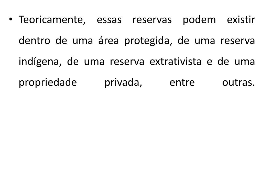Teoricamente, essas reservas podem existir dentro de uma área protegida, de uma reserva indígena, de uma reserva extrativista e de uma propriedade privada, entre outras.