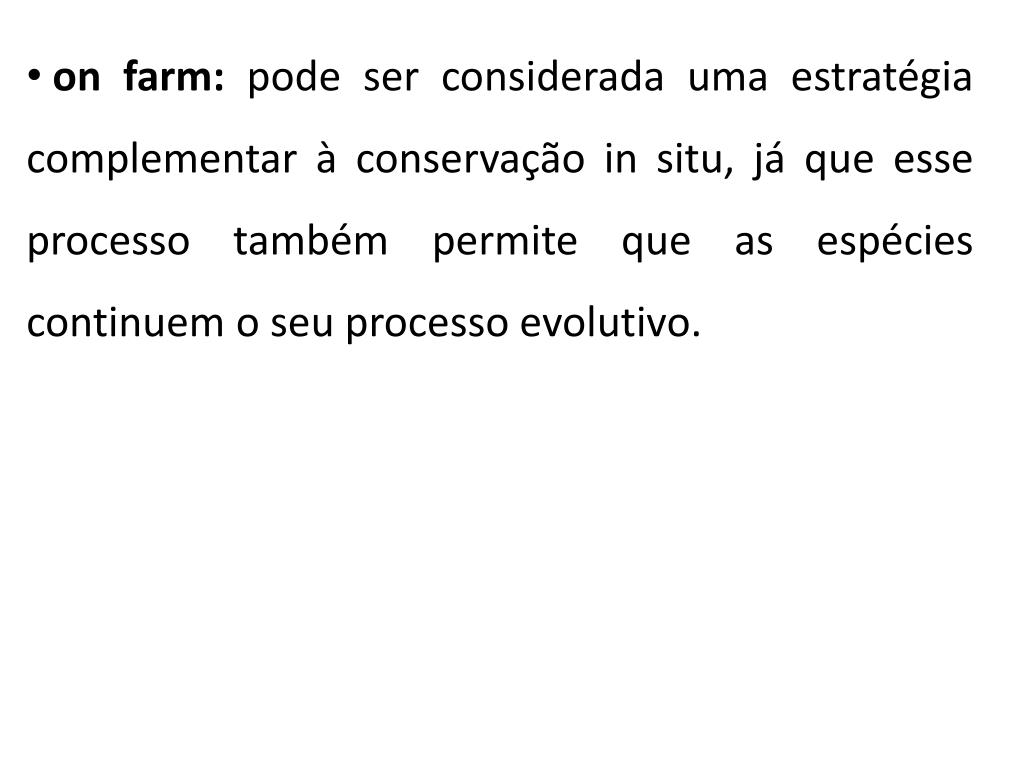 onfarm: pode ser considerada uma estratégia complementar à conservação in situ, já que esse processo também permite que as espécies continuem o seu processo evolutivo.