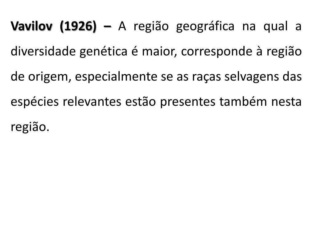 Vavilov (1926) – A região geográfica na qual a diversidade genética é maior, corresponde à região de origem, especialmente se as raças selvagens das espécies relevantes estão presentes também nesta região.