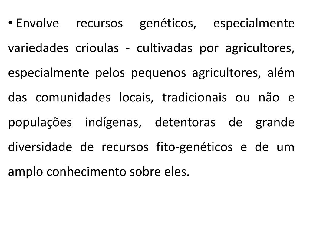 Envolve recursos genéticos, especialmente variedades crioulas - cultivadas por agricultores, especialmente pelos pequenos agricultores, além das comunidades locais, tradicionais ou não e populações indígenas, detentoras de grande diversidade de recursos fito-genéticos e de um amplo conhecimento sobre eles.
