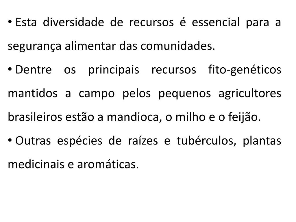 Esta diversidade de recursos é essencial para a segurança alimentar das comunidades. • Dentre os principais recursos fito-genéticos mantidos a campo pelos pequenos agricultores brasileiros estão a mandioca, o milho e o feijão. • Outras espécies de raízes e tubérculos, plantas medicinais e aromáticas.
