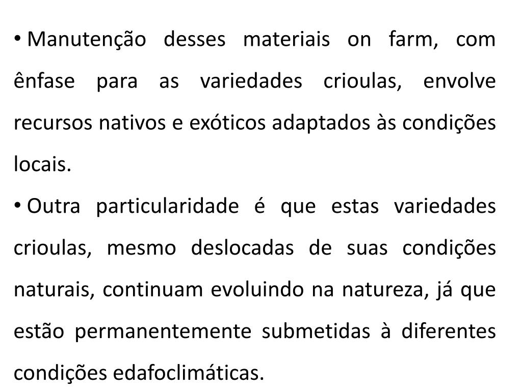 Manutenção desses materiais onfarm, com ênfase para as variedades crioulas, envolve recursos nativos e exóticos adaptados às condições locais. • Outra particularidade é que estas variedades crioulas, mesmo deslocadas de suas condições naturais, continuam evoluindo na natureza, já que estão permanentemente submetidas à diferentes condições edafoclimáticas.