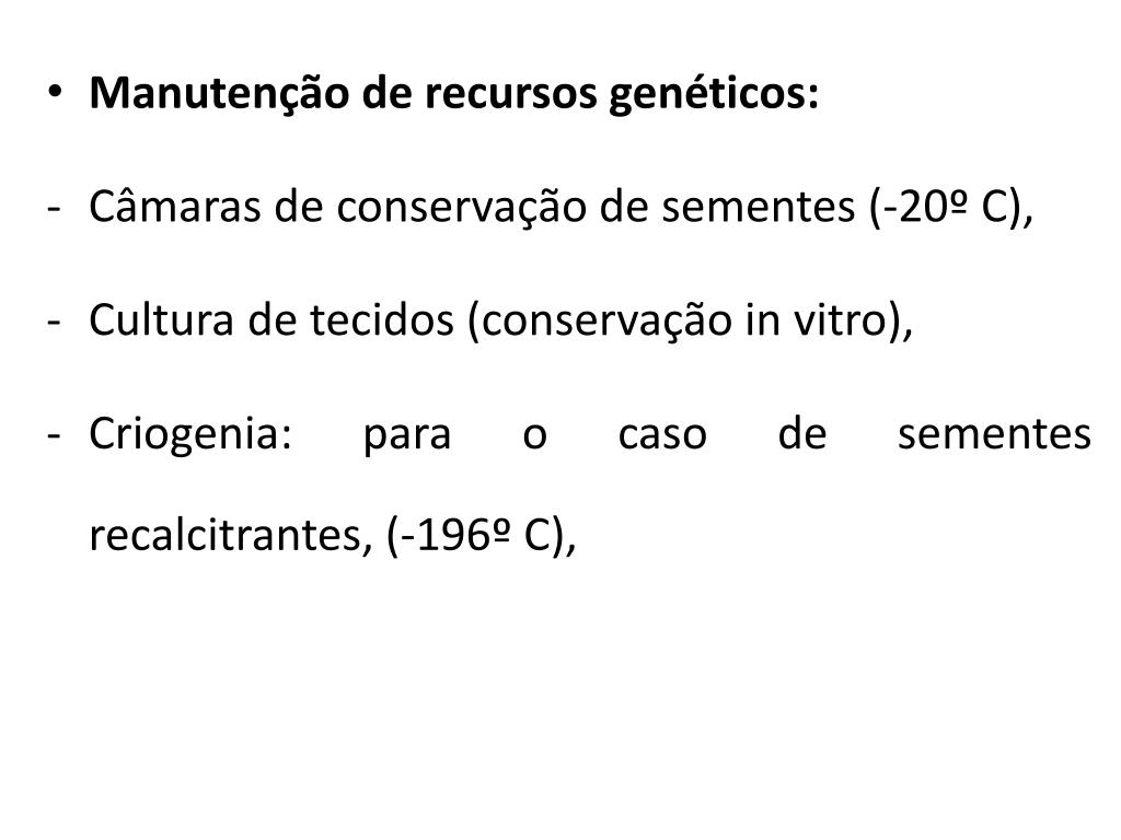 Manutenção de recursos genéticos: • Câmaras de conservação de sementes (-20º C), • Cultura de tecidos (conservação in vitro), • Criogenia: para o caso de sementes recalcitrantes, (-196º C),