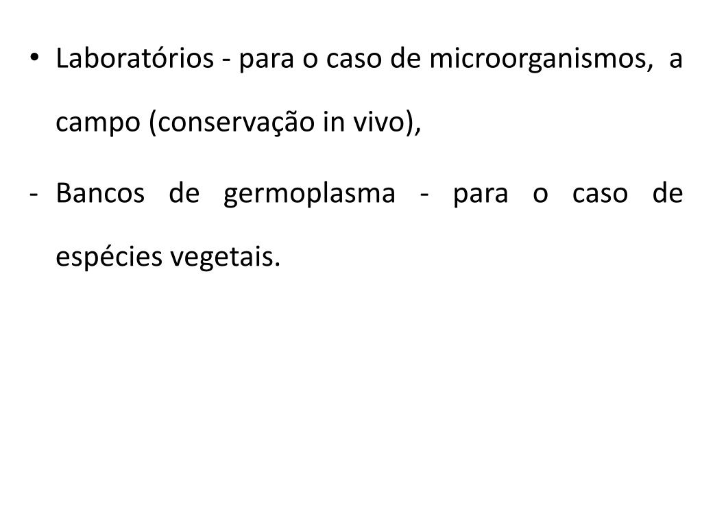 Laboratórios - para o caso de microorganismos, a campo (conservação in vivo), • Bancos de germoplasma - para o caso de espécies vegetais.