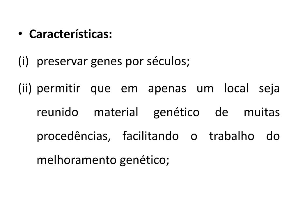 Características: • preservar genes por séculos; • permitir que em apenas um local seja reunido material genético de muitas procedências, facilitando o trabalho do melhoramento genético;