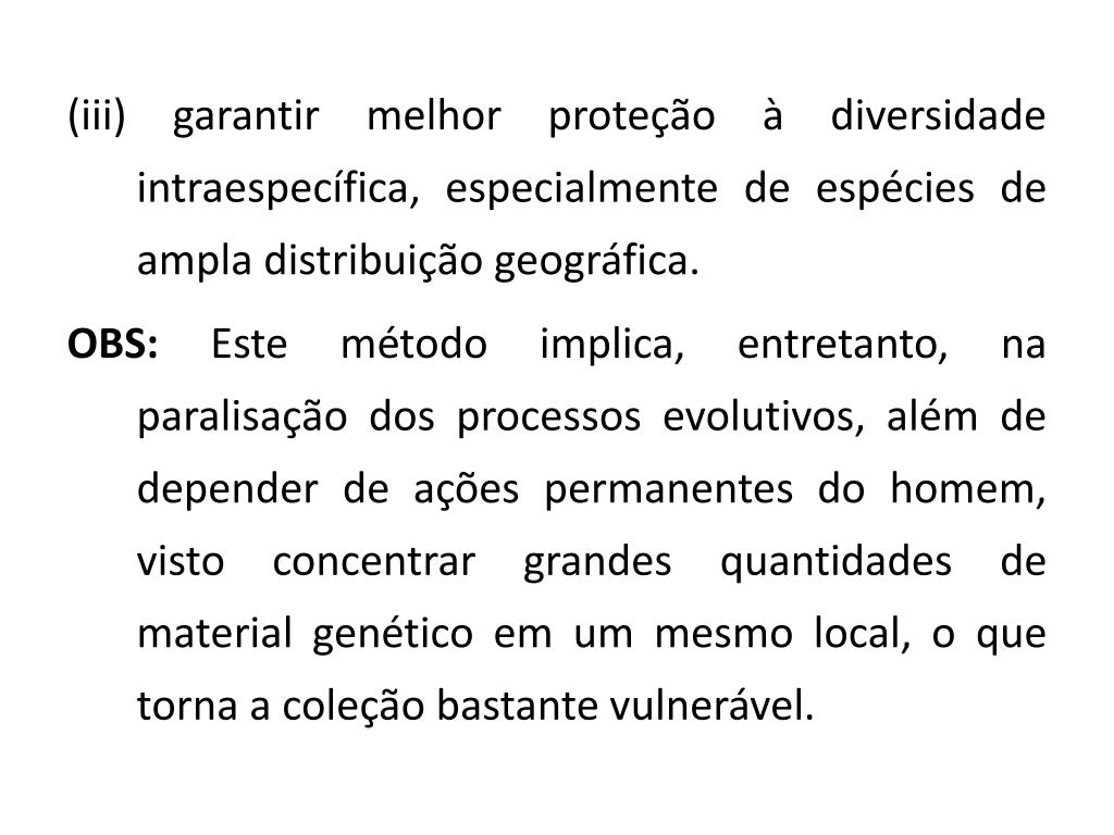 (iii) garantir melhor proteção à diversidade intraespecífica, especialmente de espécies de ampla distribuição geográfica. OBS: Este método implica, entretanto, na paralisação dos processos evolutivos, além de depender de ações permanentes do homem, visto concentrar grandes quantidades de material genético em um mesmo local, o que torna a coleção bastante vulnerável.