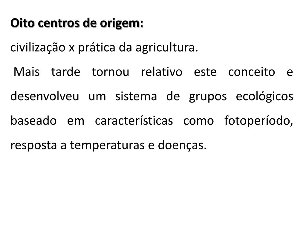 Oito centros de origem: civilização x prática da agricultura. Mais tarde tornou relativo este conceito e desenvolveu um sistema de grupos ecológicos baseado em características como fotoperíodo, resposta a temperaturas e doenças.